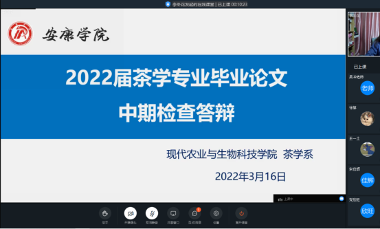 为了加强毕业论文过程监控和督促毕业论文顺利进行,应对当前疫情防控严峻形式,茶学专业于3月16日下午召开线上“2022届茶学专业毕业论文中期检查答辩”。本次活动由系主任李冬花老师主持,齐玉岗、马瑛、谢满超、吴冲等茶学专业老师以及2018级茶学专业全体员工参加了此次会议。