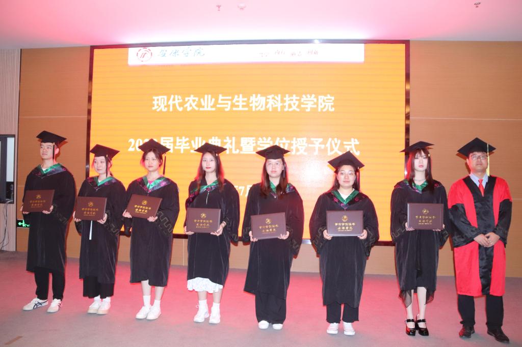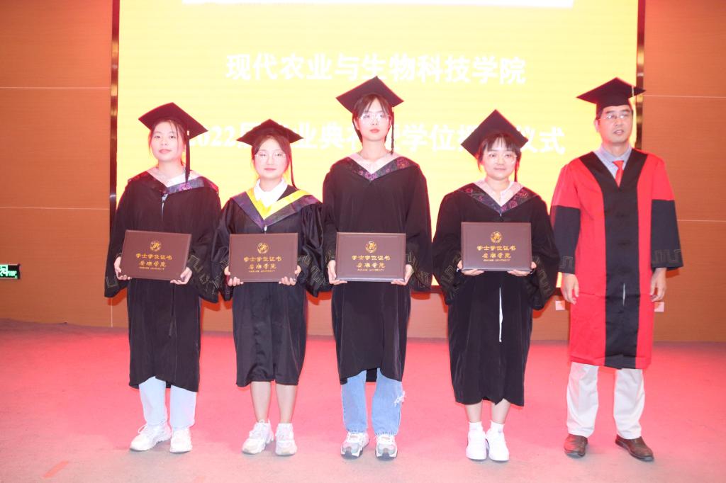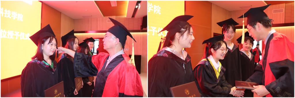 王健、杨松杰、朱新鹏、谢满超、段展展、梁如为获得学士学位的毕业生代表一一正冠拨穗、授证并合影留念。典礼在全体师生的合影下落下帷幕。