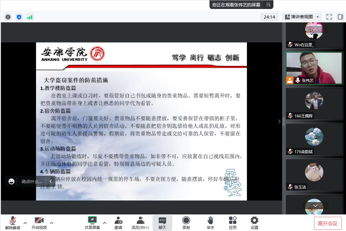 为深入扎实做好新生入学安全教育工作,近日,好博体育学工办主任谭自力、2022级辅导员张伟艺老师利用网络平台在线上为新生做安全教育讲座。