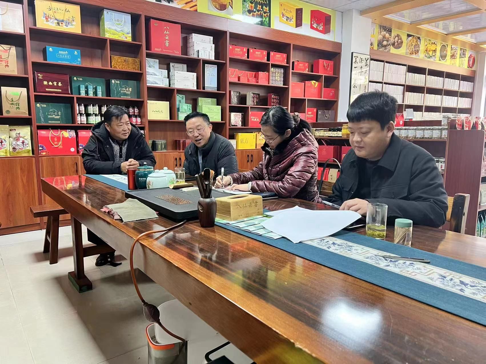 在平利县八仙镇党委副书记杜官礼,平利县八仙云雾茶业有限公司总经理罗显春、西安交通大学派驻八仙镇鸦河口村第一书记辛华以及企业工作人员的带领下,参观了八仙云雾茶业有限公司的茶叶生产车间,并就企业的发展问题进行了座谈。座谈会主要围绕八仙镇茶叶种植栽培、茶叶生产加工、商品茶包装销售、茶叶品牌打造和宣传等事宜进行了深入交流。