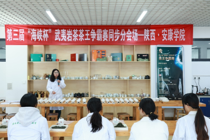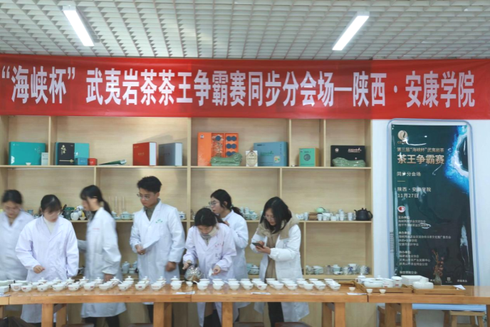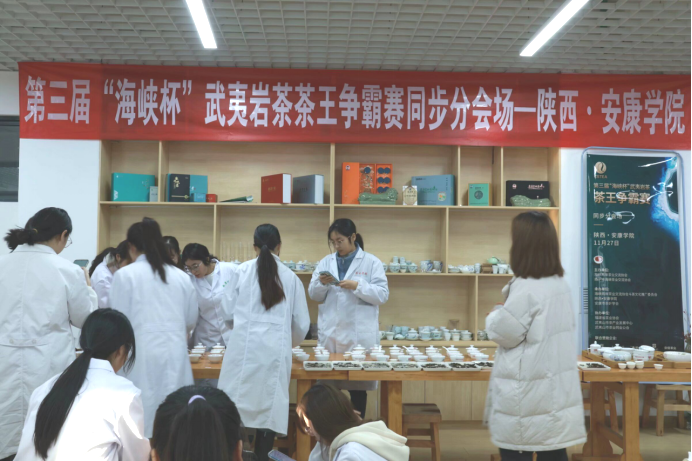 2023年11月27日下午,由海峡两岸茶业交流协会、南平市海峡茶业交流协会共同主办,好博体育官方、安康市茶叶协会承办的第三届“海峡杯”武夷岩茶争霸赛分会场,在公司江北校区产教融合大楼茶艺实训室举行。