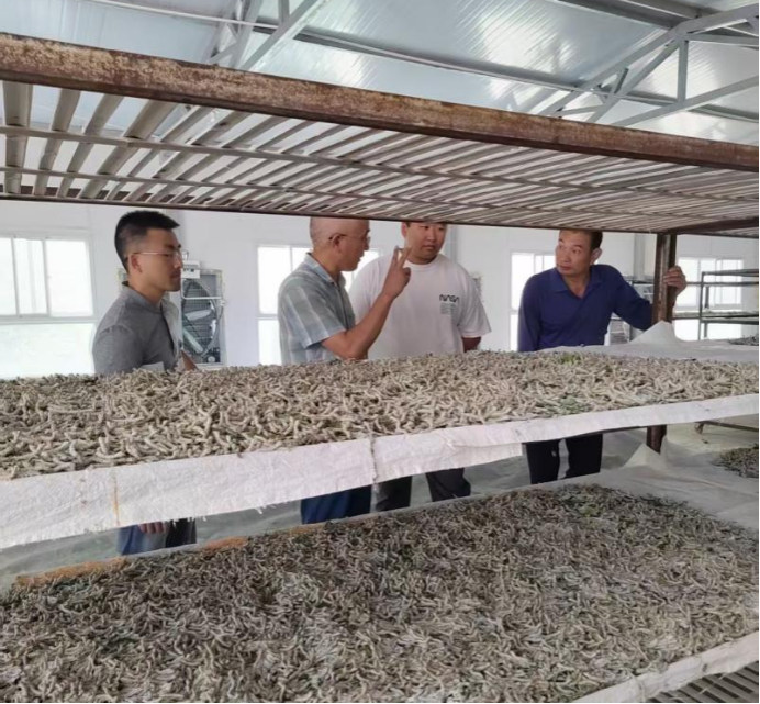 彭云武、孟刚和张笙源在蚕棚与蚕农交流养蚕技术,建议蚕农注意大蚕期的通风,加强每天的蚕体消毒防病;针对采摘桑叶困难,提出多批次养蚕和加强桑园梳芽、施肥工作。