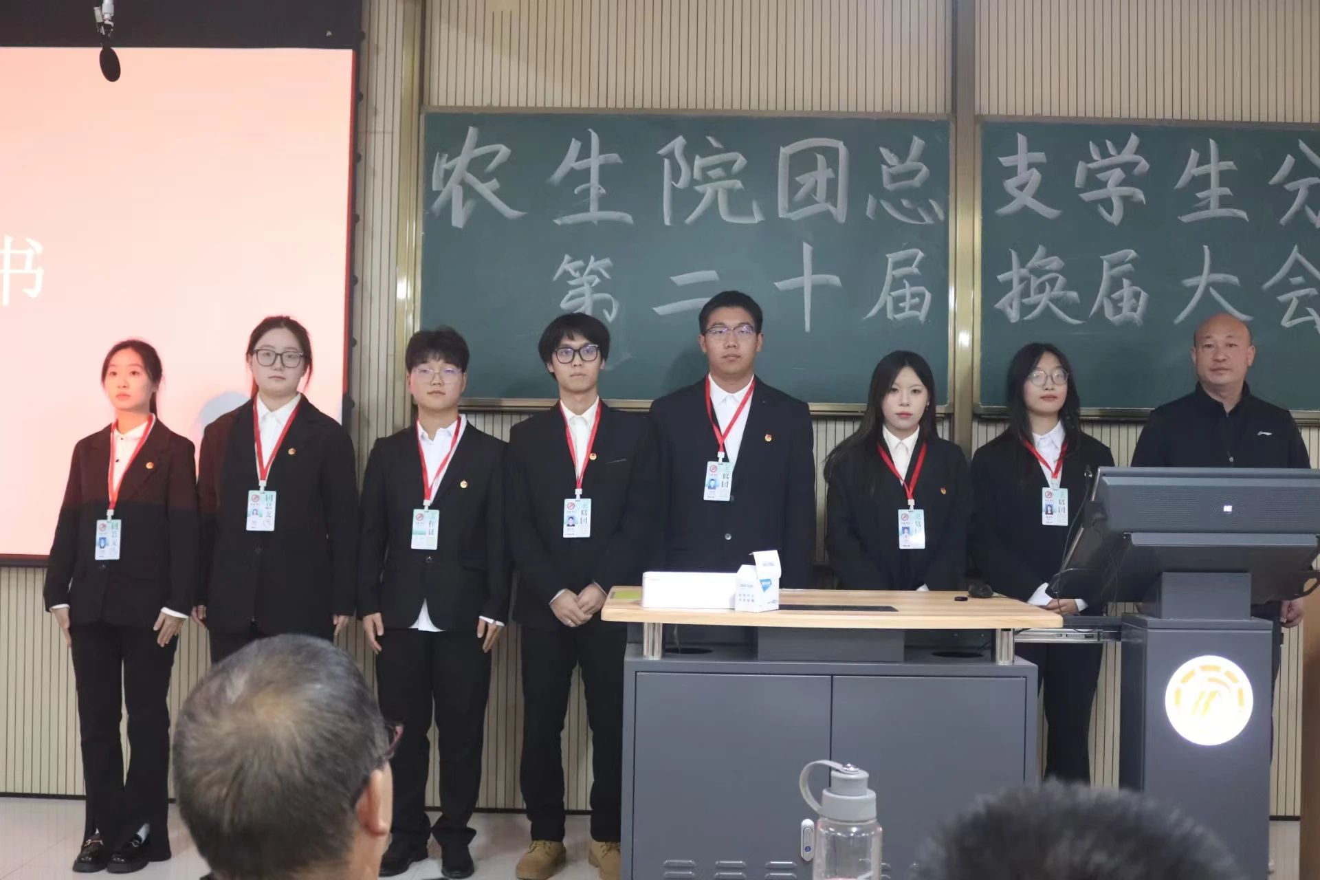孙保本为第十九届团总支员工分会成员颁发聘书,与会学工老师为新一届团学干部颁发工作证,并合影留念。在参会师生的见证下,团总支、员工分会各部门进行庄严宣誓。